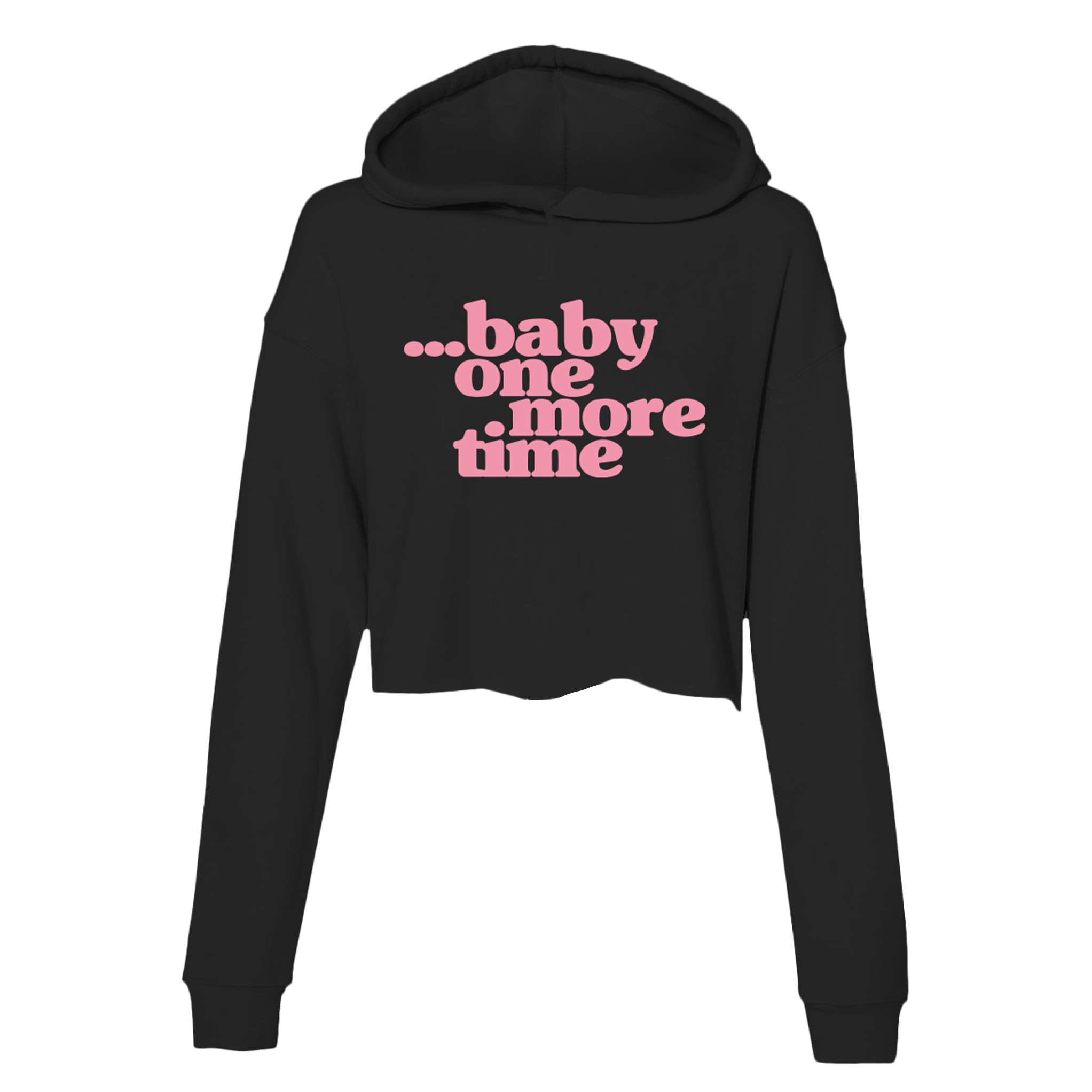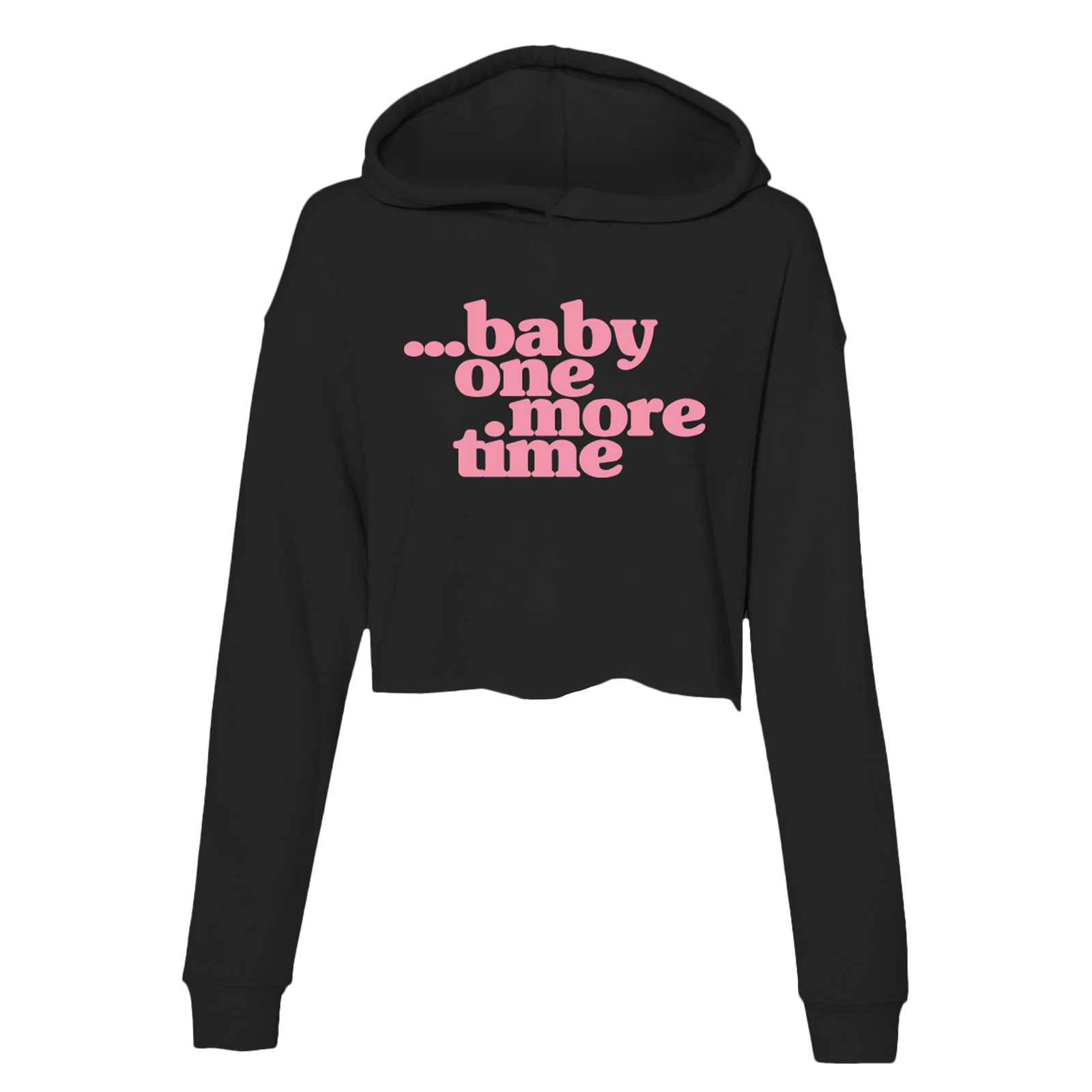 Ladies black cropped hoodie featuring "…baby one more time" on the front.