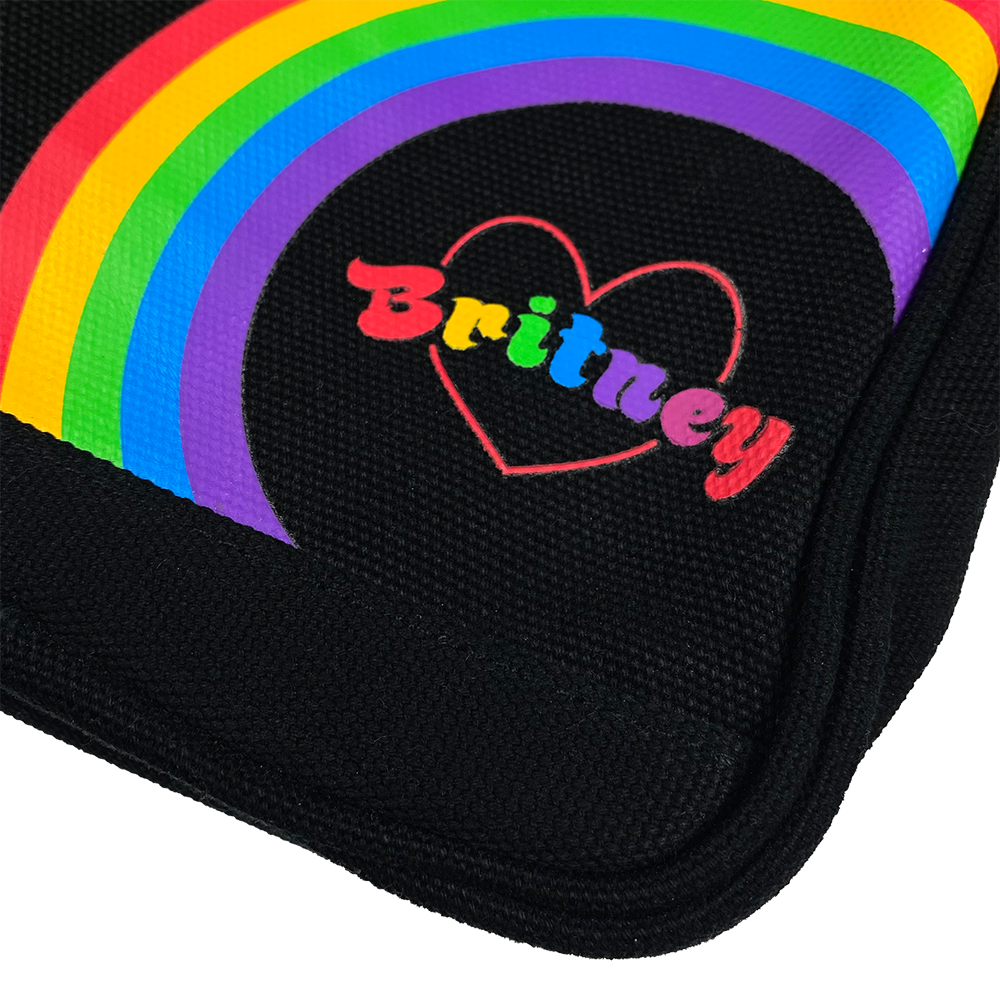Custom black heavyweight canvas crossbody bag featuring a rainbow design on the bottom right corner.