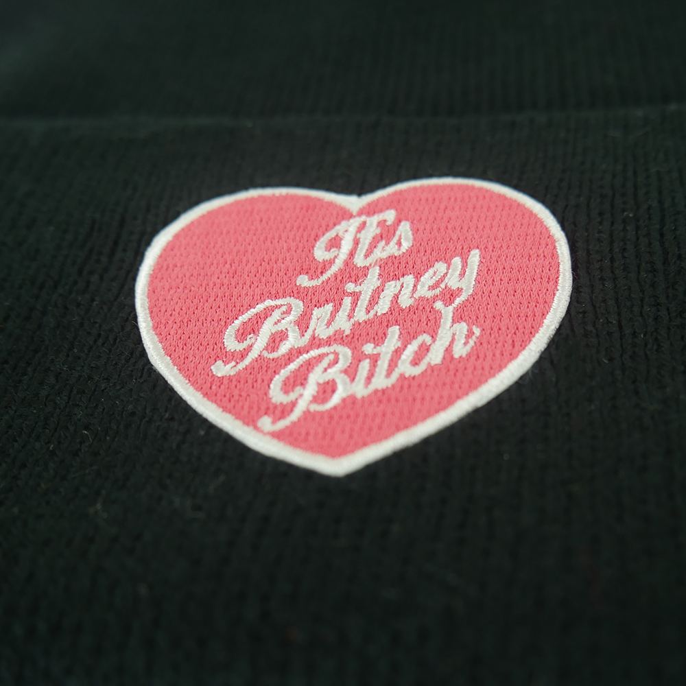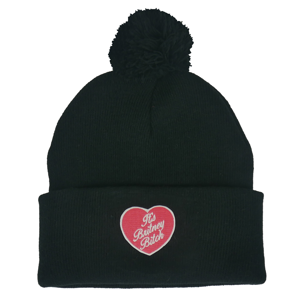 Black pom beanie featuring an embroidered pink heart-shaped patch emblazoned with "It's Britney Bitch".