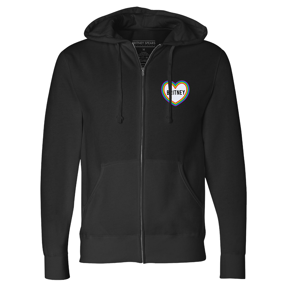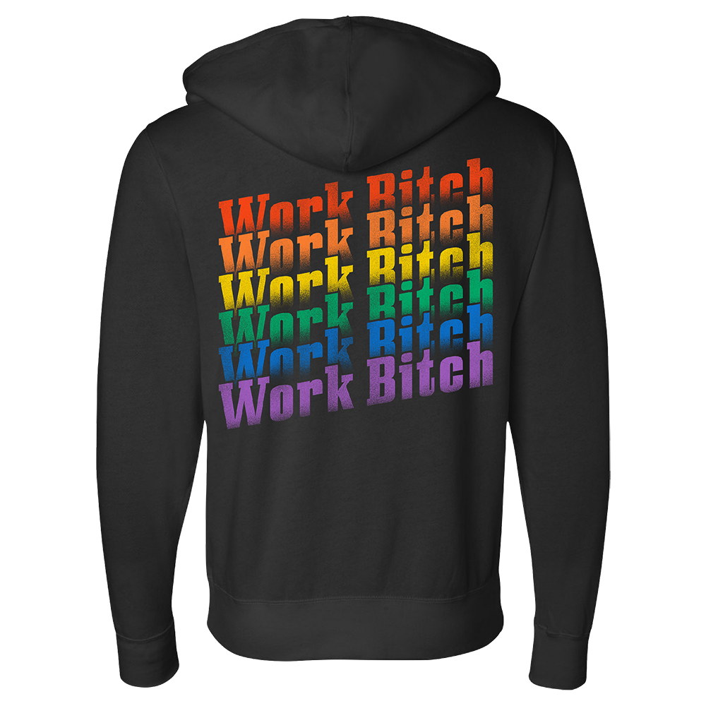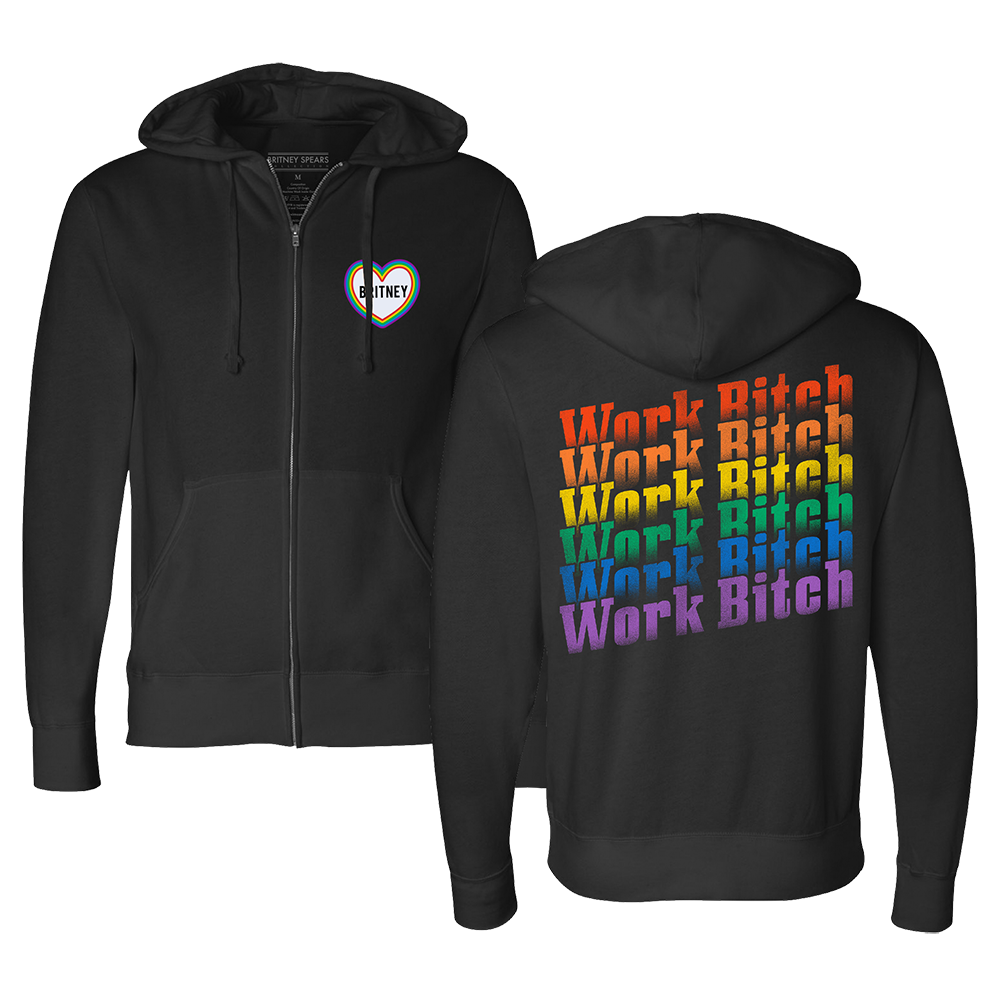 Black zip hoopdie featuring a rainbow Britney heart patch on the front left chest and "Work Bitch" repeated in rainbow colors on back.