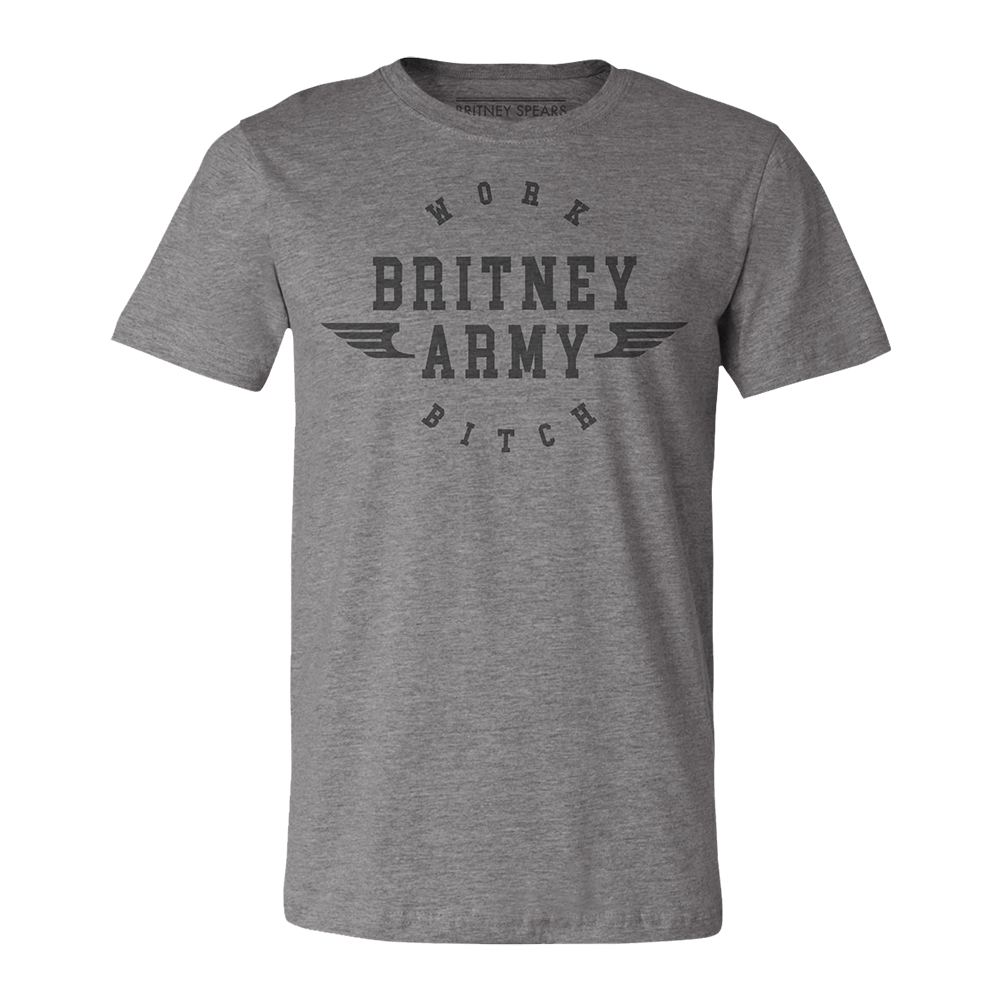 Heather grey unisex crewneck tee featuring "BRITNEY ARMY WORK BITCH" design on the front.