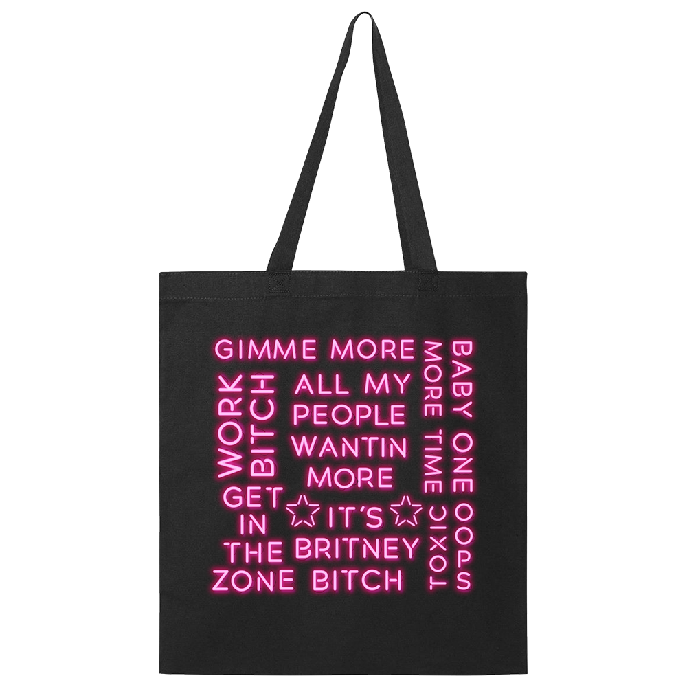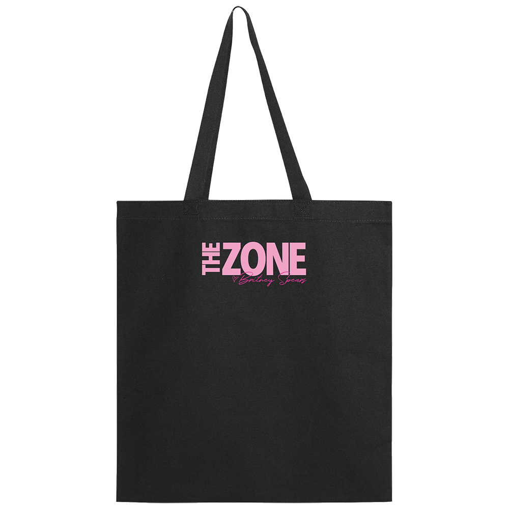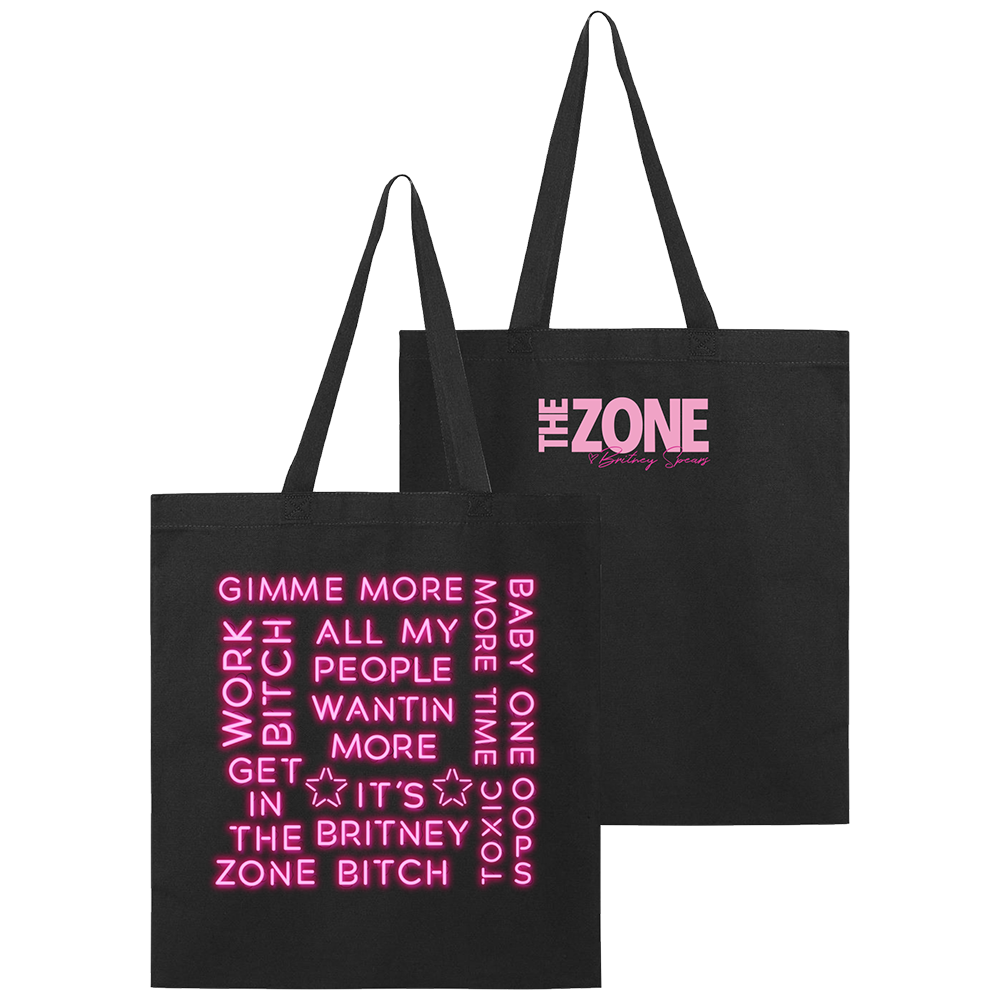 Black tote bag featuring Britney lyrics on one side and The Zone logo on the other.