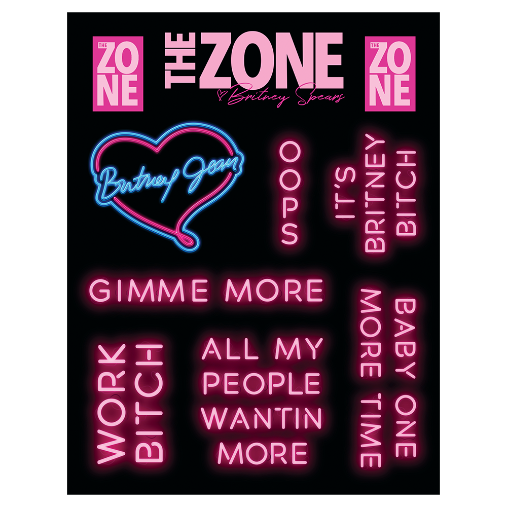 The Zone sticker sheet features the Zone logo, Britney Jean logo, and various song titles.